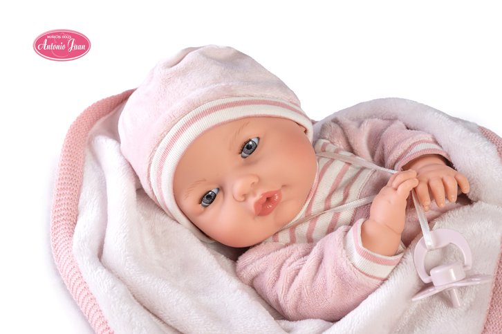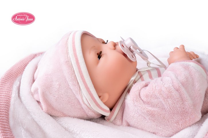 How warm Bimba is with the winter blanket! She wears soft pajamas with matching hat. If you put her to bed she will close her eyes and fall asleep peacefully. Bimba is a doll with a sound mechanism from Muñecas Antonio Juan. When you remove the pacifier, she cries and calls her parents, but if you put the pacifier on her, she will calm down. She has a soft cloth body so you can give her hugs and soft vinyl limbs. It measures 37 cm and weighs 430 gr. Bimba can’t wait for you to take her in her arms to close her eyes and sleep for a while!