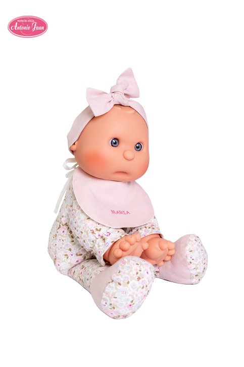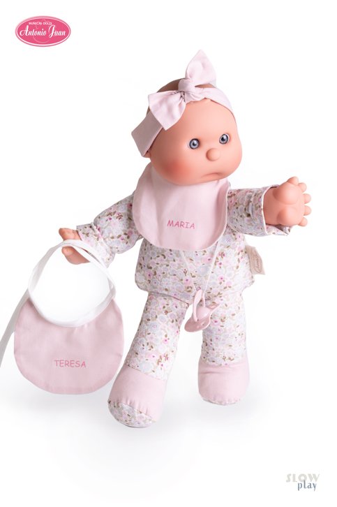 Sweet and easy to handle, it has been designed with the smallest of the house playing in mind. With her soft body and her soft vinyl hands and head, they make her her first playmate, with all the guarantees and safety of toys for early childhood. My First Antonio Juan Dolly with personalized bib is a novelty. You can personalize it with your name, your child’s name or the name to make a gift! She measures 36 cm and weighs 305 gr. She has a cloth body, arms and legs, so you can give her soft hugs. Her face and hands are made of soft vinyl. My First Antonio Juan Dolly with customizable bib wears a pink headband and pacifier. Her clothes are made with “Organic Cotton” fabrics, which means that no chemical products have been used in its cultivation and production process, only natural ones. My First Antonio Juan Dolly with customizable bib is recommended for children from 18 months.