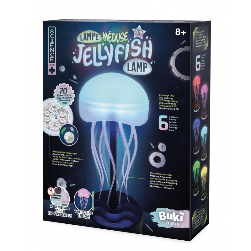 Build a jellyfish lamp by assembling the parts and gears. The lamp lights up with 6 different colour combinations that can change automatically.