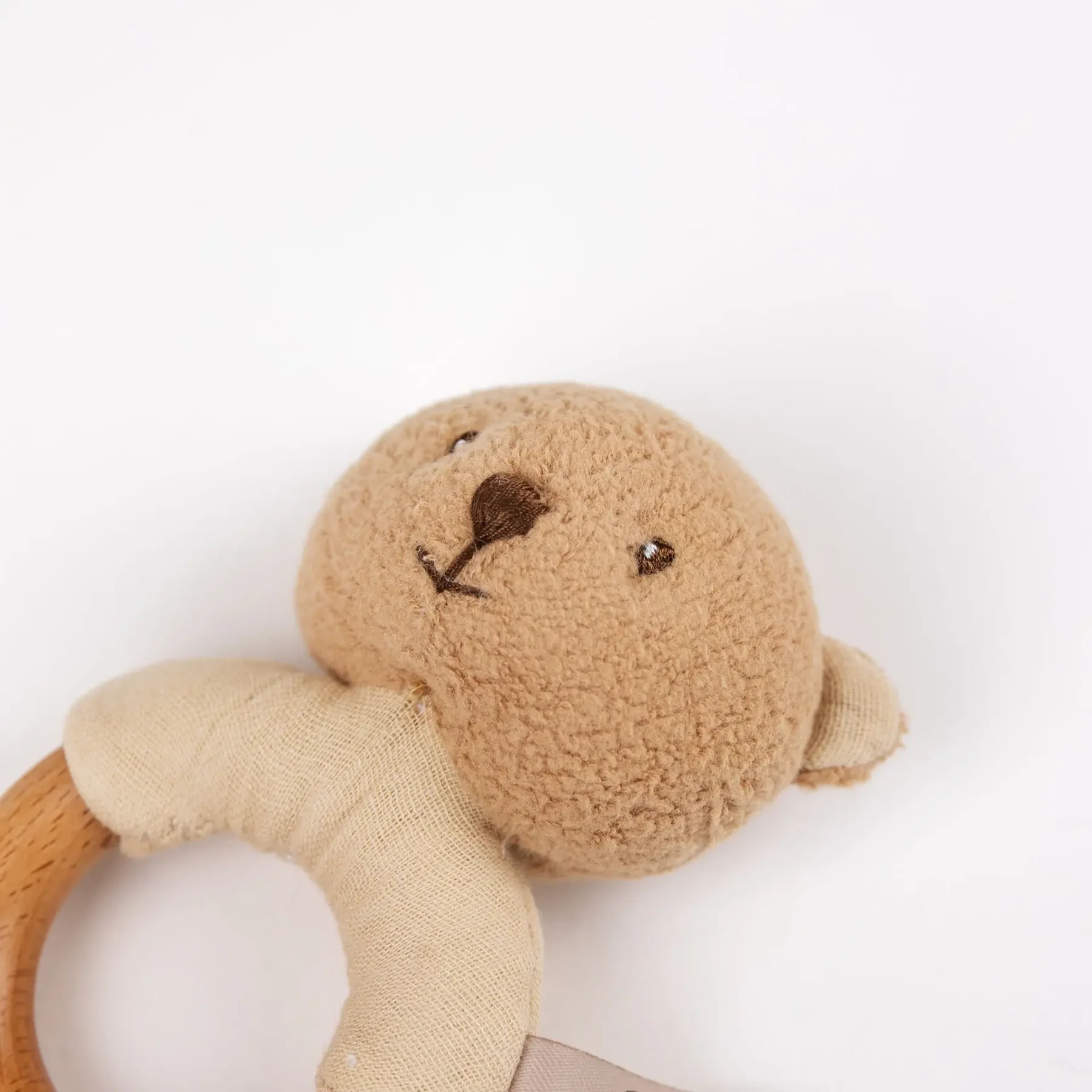 Little fingers wrap around the smooth wooden ring whilst Marcel’s soft bear face watches every wiggle and giggle. The gentle rattle sound turns quiet moments into delightful discoveries.