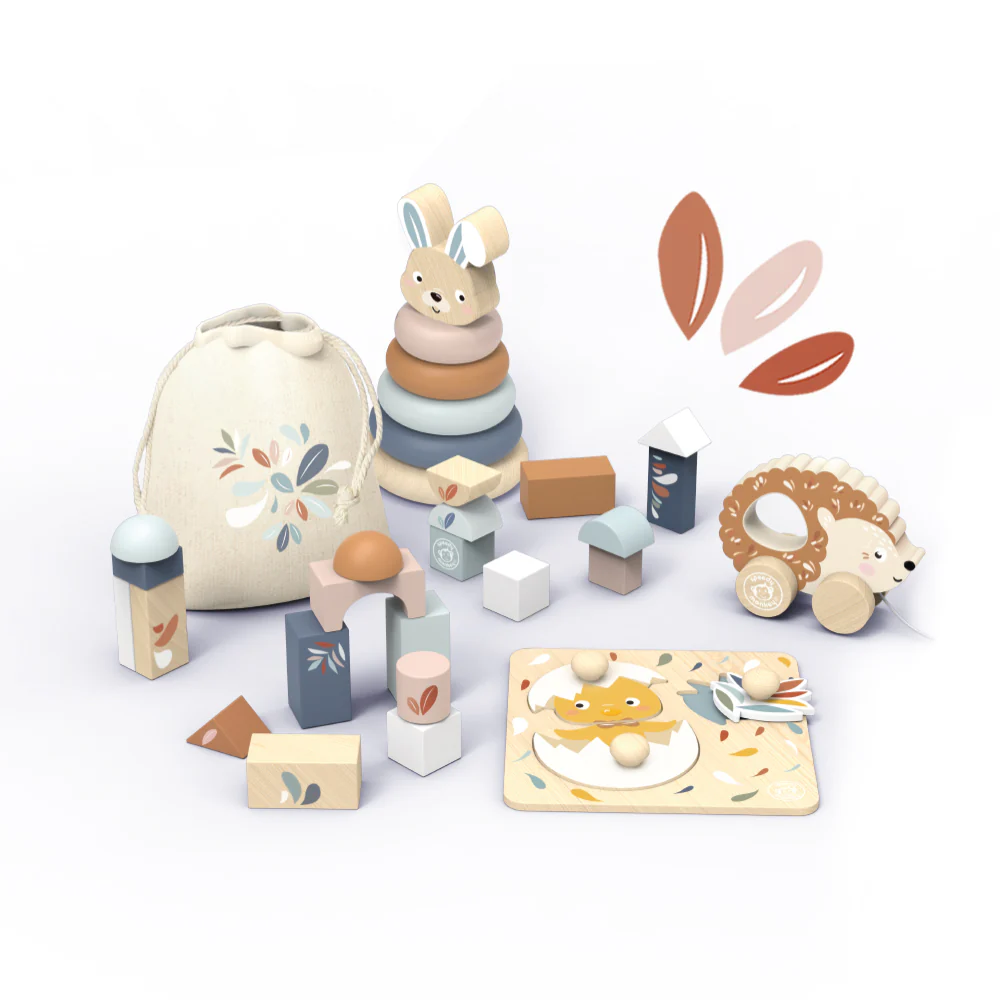 This toy box is not only visually appealing but also functional, providing a safe and spacious storage solution for your child’s favorite toys. Made from high-quality wood, it ensures durability and longevity. Includes buildings blocks with fabric pouch, stacking rabbit, chick puzzle and pull-along hedgehog.