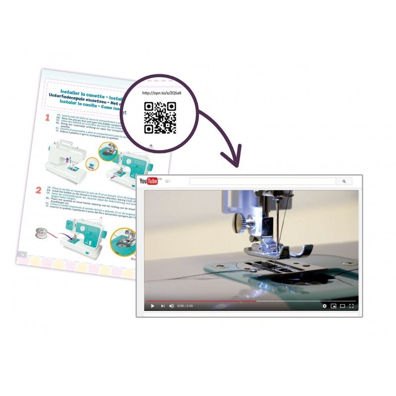 Several accessories, including metal spools and spare needles for the machine, are included. How to make the clothes and the basics of sewing are explained step-by-step in illustrated instructions featuring QR code links to video tutorials!