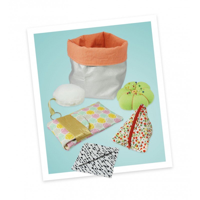 A sewing machine to help you learn the basics of sewing and create 6 trendy projects: a bookmark, a key ring, a storage basket, a pouch, a purse and a pincushion!